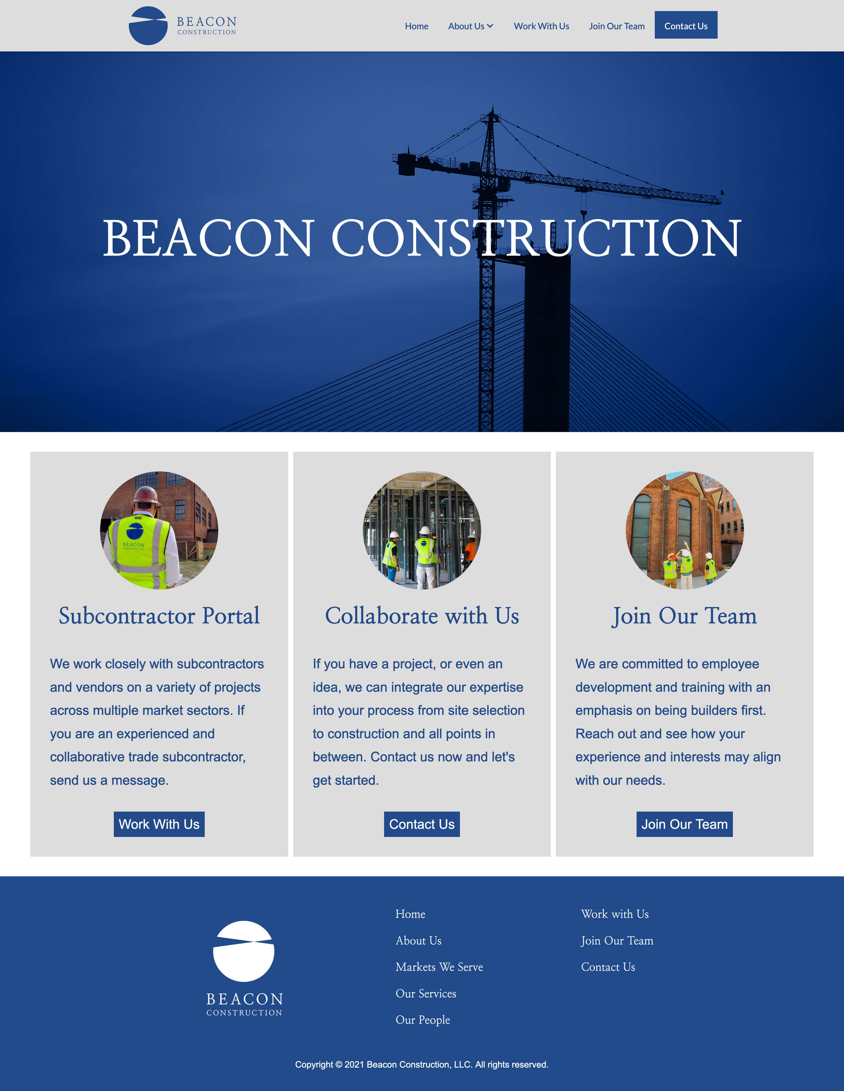 Beacon Construction was started by a pair of construction experts, Andy and Jarred, who have more than 50 years of experience in every step of commercial construction. They began working together to create a company that could be more involved through every step of the construction process. Most commercial construction companies are only available to work with clients once plans are fully developed and end their contract as soon as building is completed, but Beacon Construction decided to stick with their clients all the way through. Sydney helped develop the company from the start, even with naming and messaging. She developed a subtle, professional brand that wouldn’t detract from their message, while still visually communicating their expertise. The website she developed did the same, providing a simple web presence to help inform their potential clients about their capabilities, as well as reach out to contractors and other industry professionals seeking partnership.