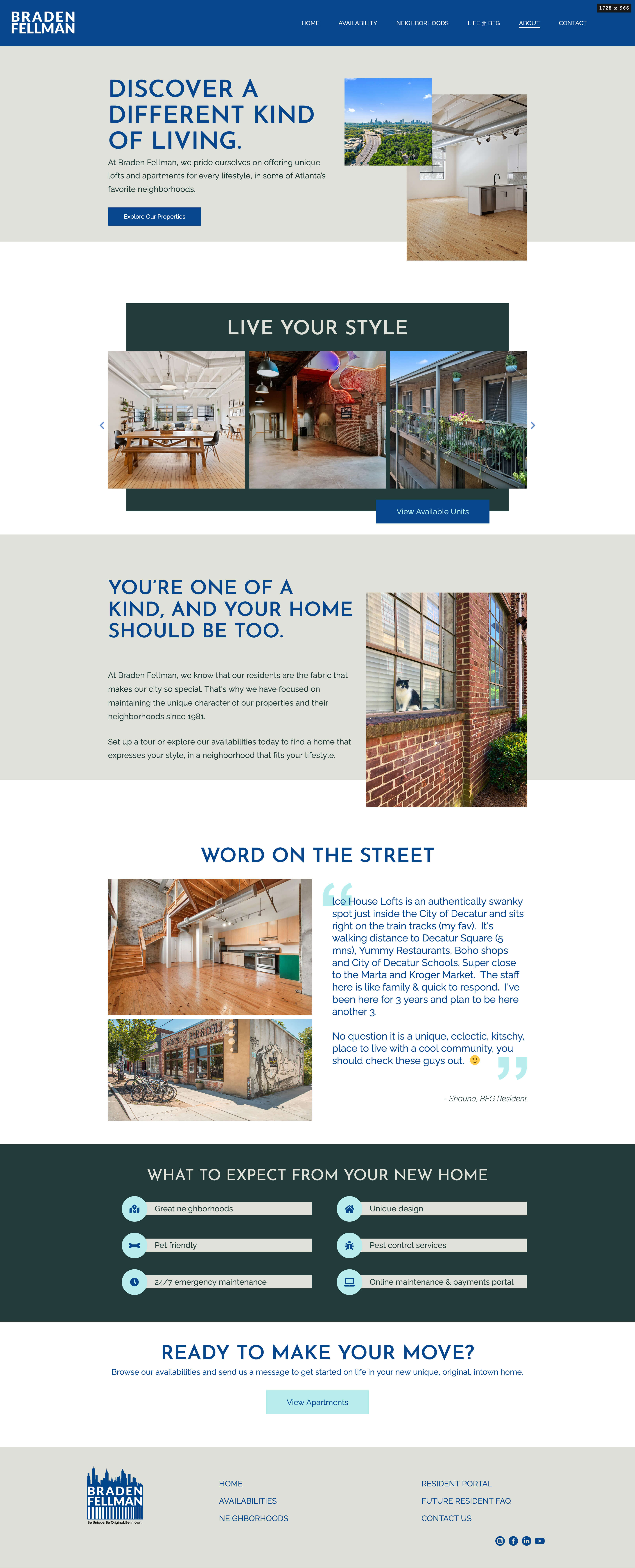 The Braden Fellman Group is a family-owned business that has been managing residential and commercial real estate in Atlanta for over 40 years. All of their properties ooze with character while still offering the functionality of modern renovations, so their website needed to be the same: functional and accessible while maintaining an affable allure.